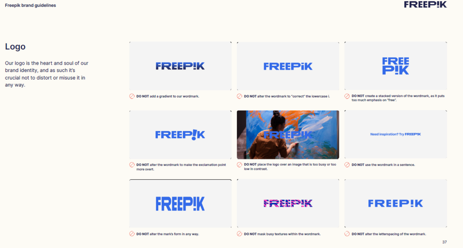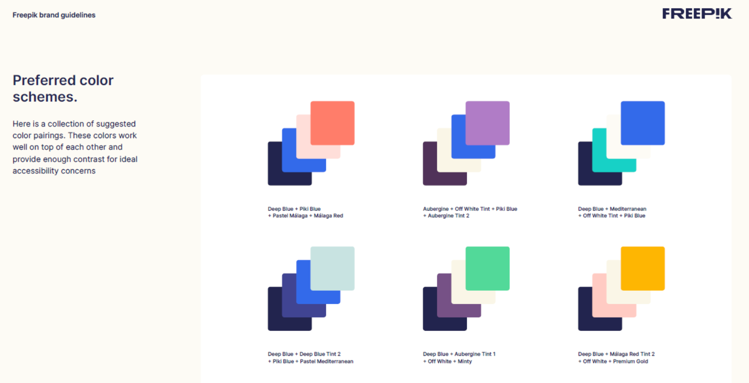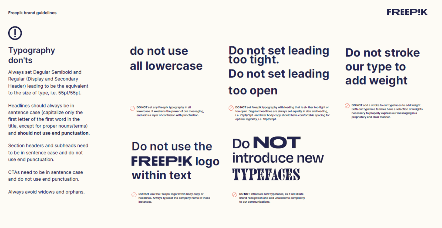 Nevertheless, Freepik is a great brand guidelines example that shows how detailed your brand guide needs to be. The usual includes voice and tone, logo usage and key design elements, such as color and typography. However, Freepik’s guide also includes sections, such as dos and don’ts for logo and typography use, as well as preferred color schemes and shades.