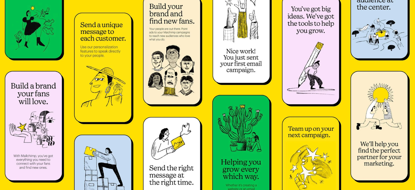 Mailchimp’s identity is a strong example. While the wordmark itself is clean, the surrounding brand system incorporates illustration, uneven lines, and playful visual elements. These hand drawn elements introduce warmth and approachability without sacrificing clarity.
