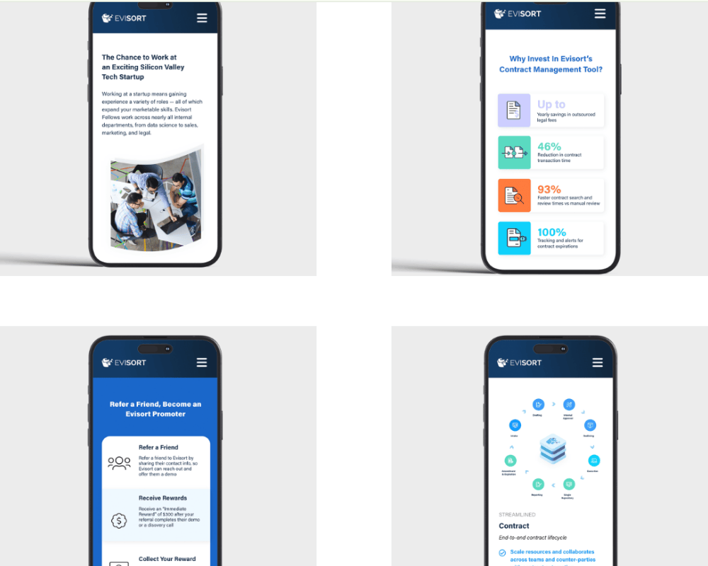 Case study example: ArtVersion worked with Evisort, an AI-powered contract lifecycle management software company, to redesign and develop their new website. They also created custom graphic elements, infographics, and marketing collateral to support a cohesive brand presence across digital platforms.