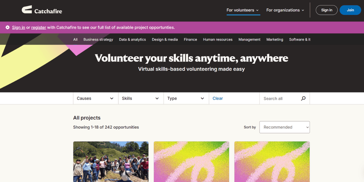 For "graphic design volunteer" searches, Catchafire is consistently where the real matches happen. Volunteer Match and VolunteerHub also list design volunteers, but with far less vetting of professional skills.