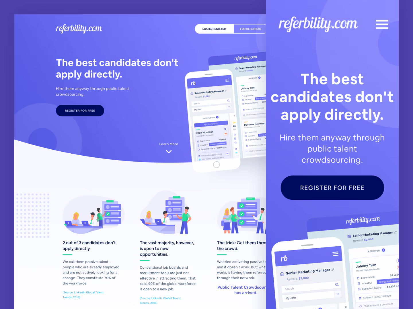 Or Referbility, who came to us needing a sleek web design for their homepage, marketing assets for their launch, and a sleek UI. Our team handled the full website flow, matching styles and bringing their vision for public talent crowdsourcing to life.
