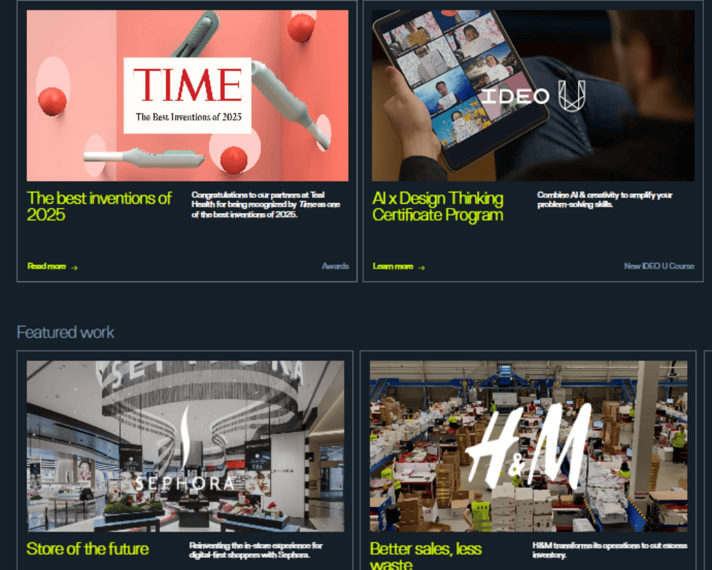 IDEO’s work often shapes how organizations approach products, services, and digital experiences, with recent projects focused on transformation, sustainability, and digital design systems.