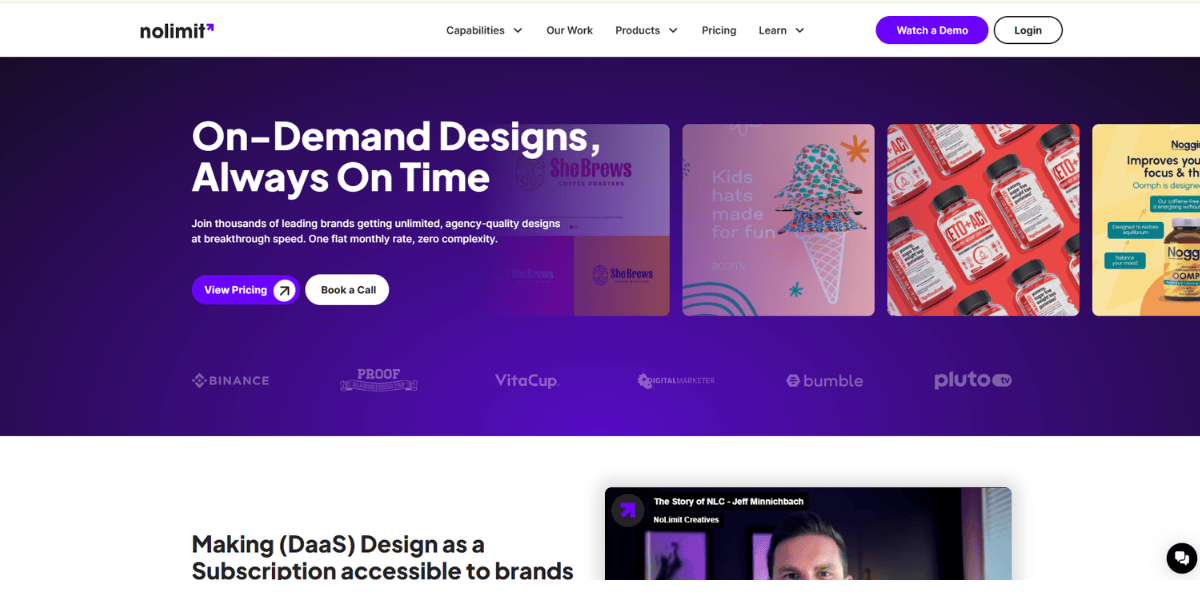 No Limit Creatives offers the most flexible pricing on this list, with plans ranging from $250/month to $1,500/month. You choose the service tier you need (logo design, branding, marketing materials, etc.) and pay accordingly. They've served 4,000+ customers including Nestlé, KFC, and Pepsi. The model is notably flexible: you can also hire designers for one-off projects if you don't want a subscription.
