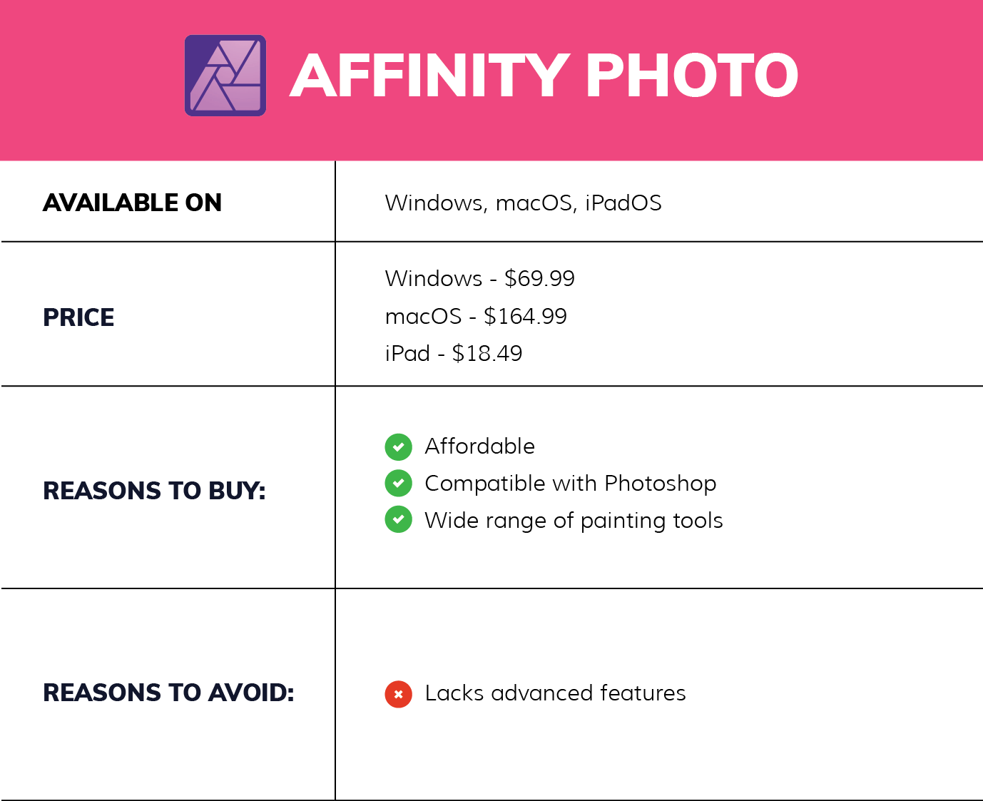 Considered one of the most robust photo editing software and the best alternative to Photoshop, it's available for a one-time payment of $69.99 for Windows or macOS, or $164.99 for the Universal Licence covering all platforms. The iPad version can be purchased separately for $18.49.