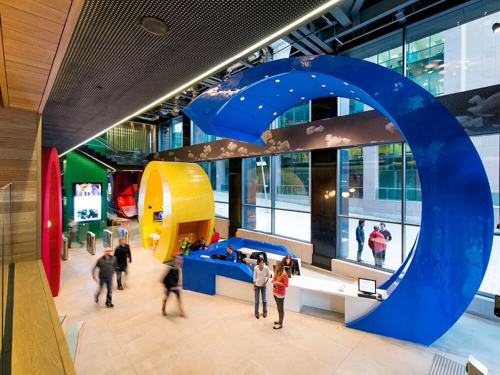 Google is one of the best examples of corporate branding in this sense. Their offices use playful graphics, themed zones, and their recognizable primary color palette for environments that resonate with their core values: a sense of belonging and playfulness.