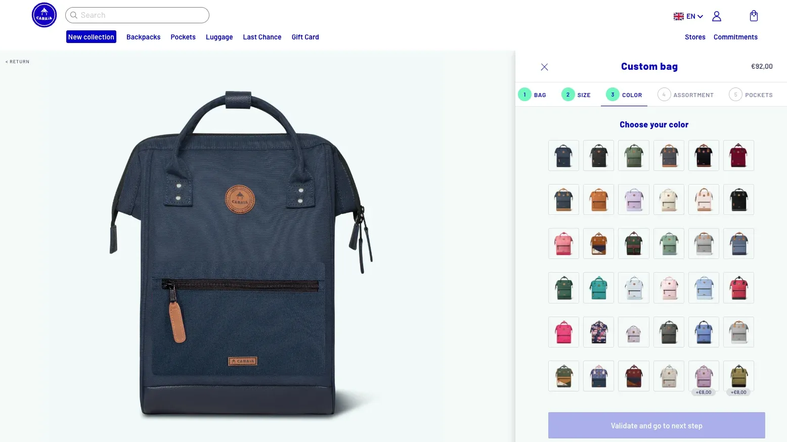 Small details matter. Microcopy, shipping tags, and clear return information placed close to your CTAs lowers hesitation. Keep a consistent color palette so buttons and links mean the same thing across the site. Prioritize readable typography and maintain clear visual order: headlines, product titles, prices, and action buttons should be read in a single glance. Look at how Cabaiia does it with their bag customization page.