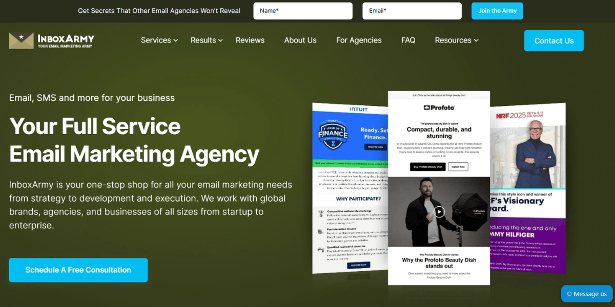 InboxArmy is a full-service email marketing agency covering strategy, design, development, automation setup, and campaign management for brands from startup to enterprise scale. Their service range sits wider than most entries on this list — they'll handle list management, deliverability monitoring, A/B testing frameworks, and ESP onboarding alongside the design work. They work across major ESPs including Mailchimp, Klaviyo, HubSpot, Salesforce Marketing Cloud, and Marketo.