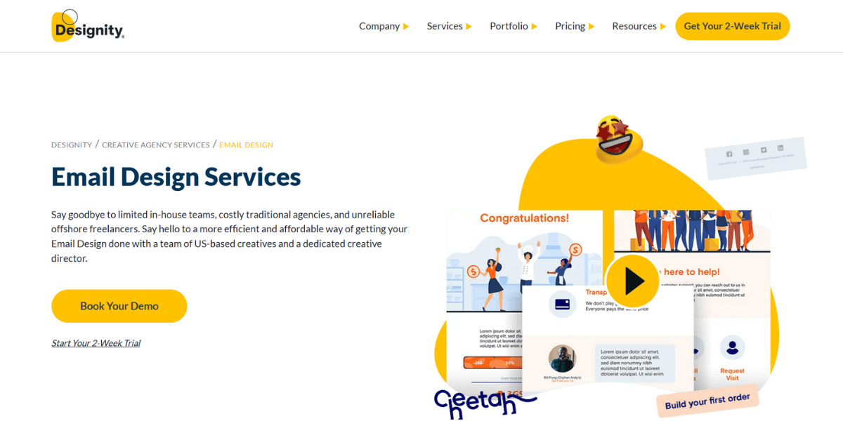 Designity runs a co-managed subscription model: you're paired with a Creative Director who handles briefing, quality control, and creative direction on your behalf, then delegates production to a team of vetted designers. Email design (templates, campaign graphics, HTML layouts) sits within their scope alongside web design, social media, and brand work.