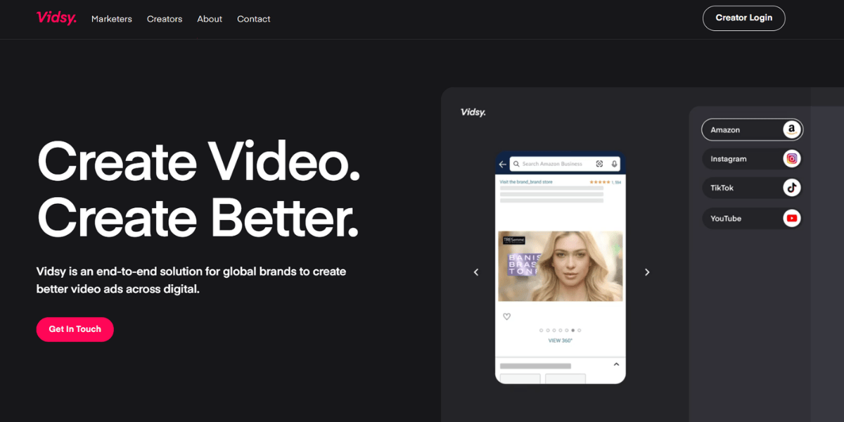 Vidsy is built differently from the other agencies on this list. Rather than a traditional production house, it is a platform combining AI-powered production workflows, a vetted global creator network, and marketing expertise to produce scalable video ads for digital channels - Instagram, TikTok, Amazon, and YouTube specifically.
